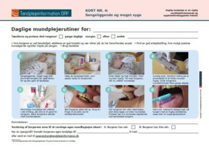 Daglige mundplejerutiner er en samling actionkort, der dels synliggør behovet for tandpleje og dels sikrer, at borgeren får den rigtige tandpleje og får alle elementer deri. Brug actionkortene til at give borgerne den bedst mulige mundpleje.